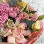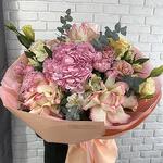 Лизиантус - 3 шт. Эвкалипт - 2 шт. Гортензия розовая - 1 шт. джульетта роза пионовидная - 2 шт. бумага дизайнерская - 3 шт. калька розовая - 4 шт. альстромериябелая поштучно - 3 шт.