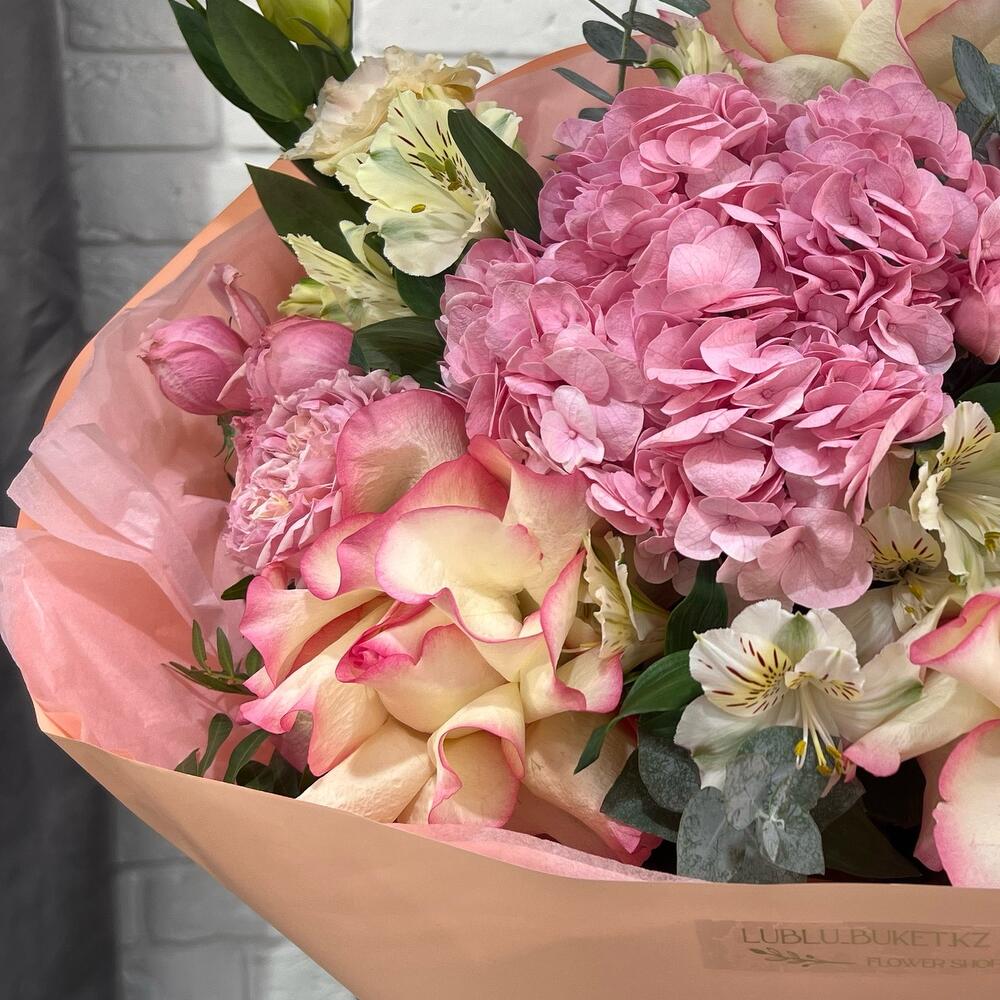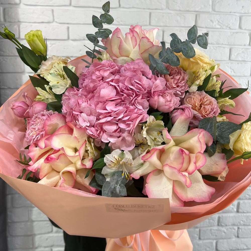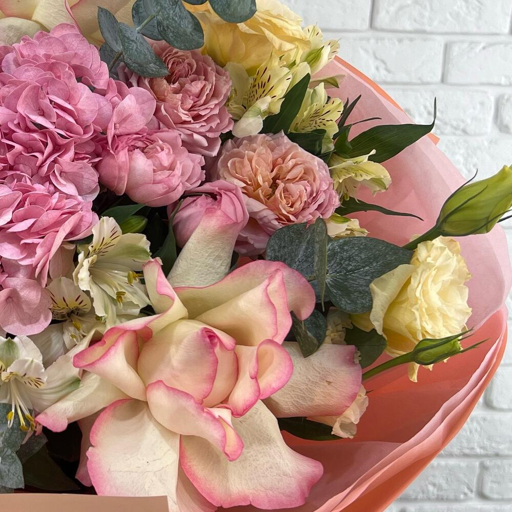 Лизиантус - 3 шт. Эвкалипт - 2 шт. Гортензия розовая - 1 шт. джульетта роза пионовидная - 2 шт. бумага дизайнерская - 3 шт. калька розовая - 4 шт. альстромериябелая поштучно - 3 шт.