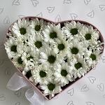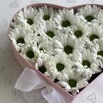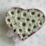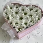 Кустовая хризантема - 3 шт. Бант - 1 шт. Коробка сердце - 1 шт. Оазис флористический - 1 шт.