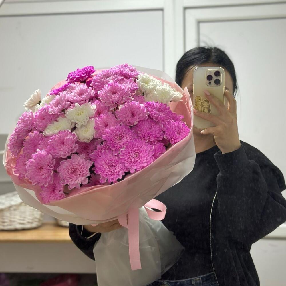 Шикарные кустовые розовые хризантемы долго порадуют обладательницу этого букета