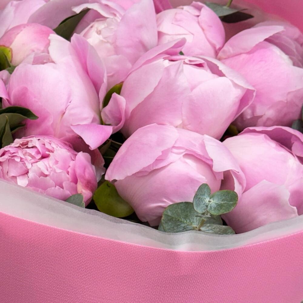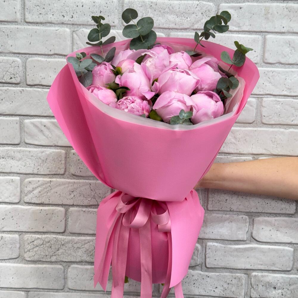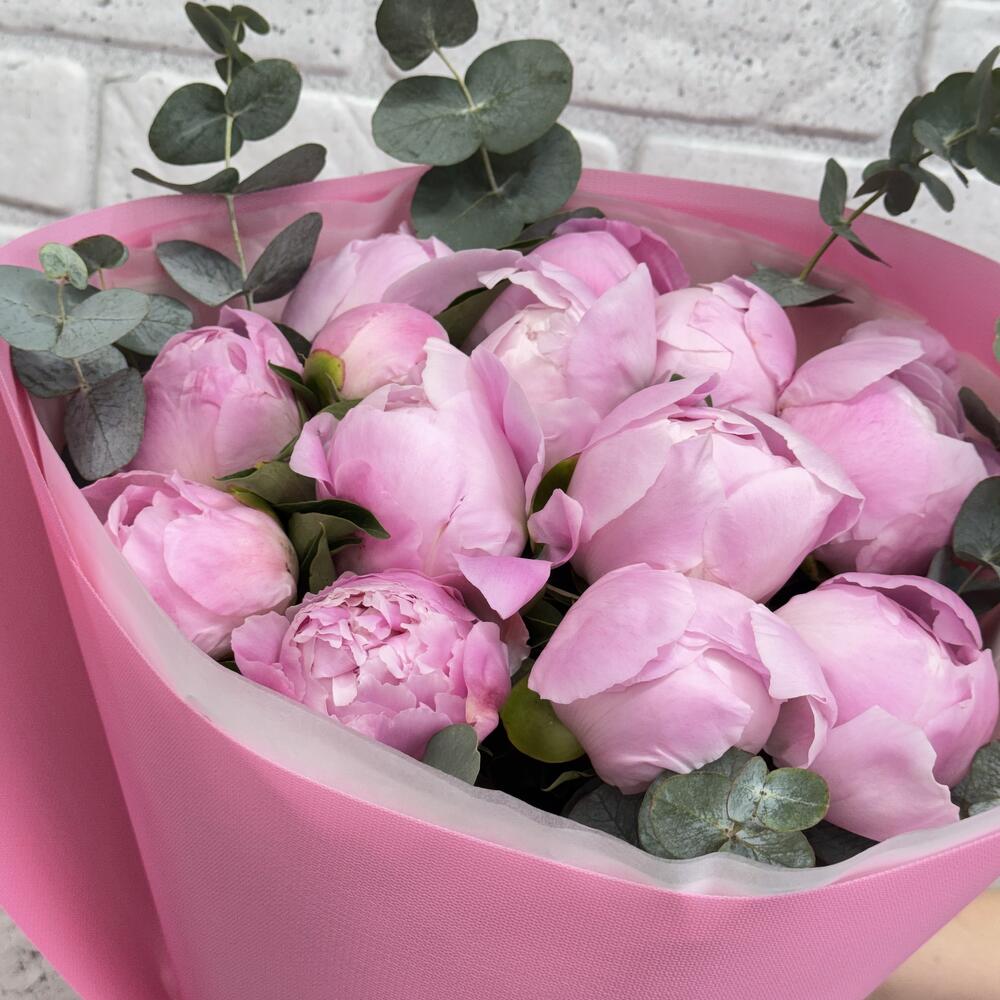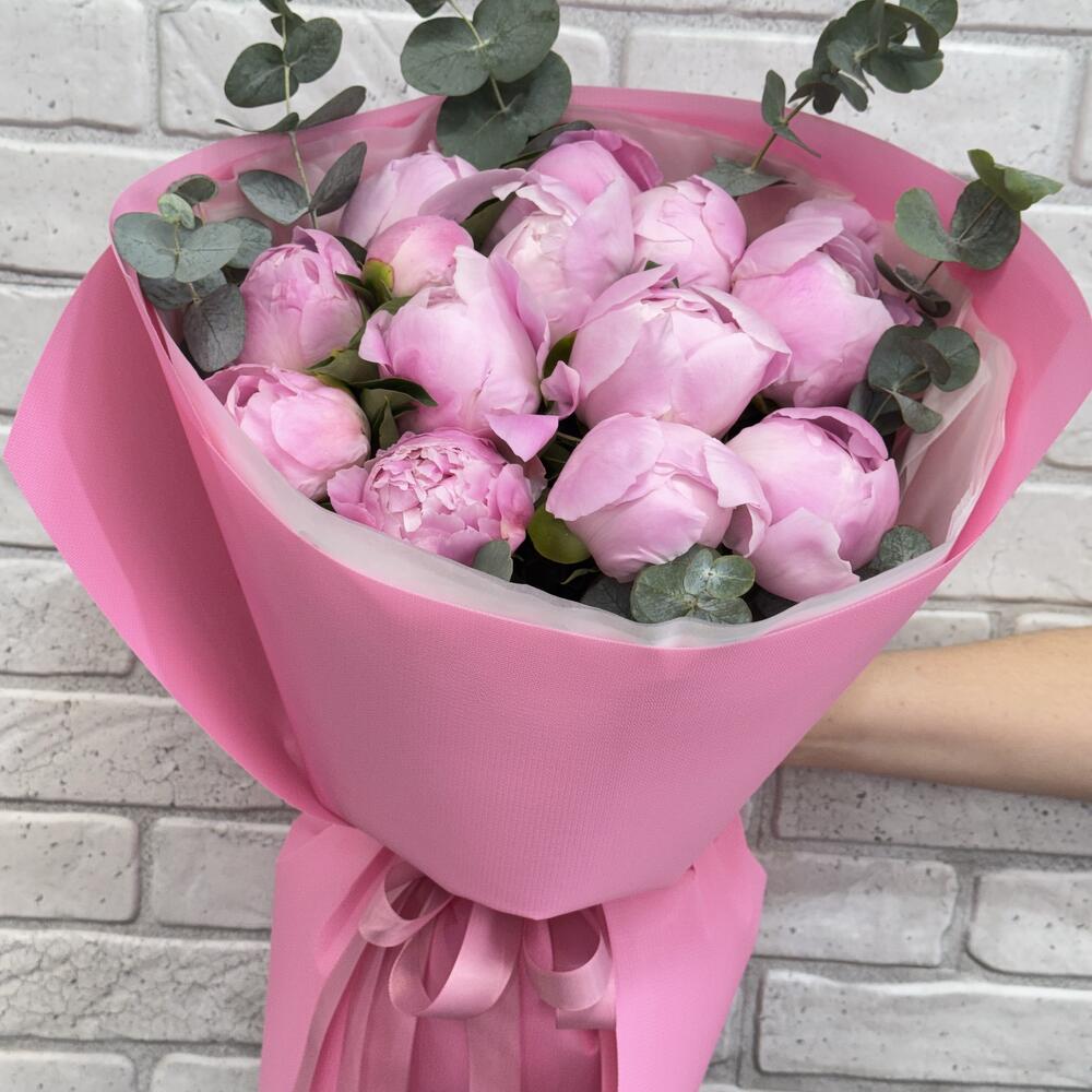 Лента - 1 шт. Пион - 13 шт. Эвкалипт - 3 шт. Тишью - 3 шт. Фоамиран (упаковка) - 3 шт.