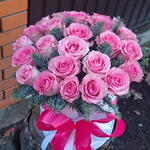 Роскошная композиция из 25 нежно-розовых роз, дополненная изящными еловыми ветвями, в стильной коробке. 🌹✨ Идеальное сочетание утонченной романтики и зимнего настроения. Такой подарок согреет душу и наполнит дом уютом и праздником!