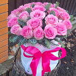 Розовая роза - 25 шт. Коробка шляпная - 1 шт. Нобилис - 2 шт.