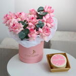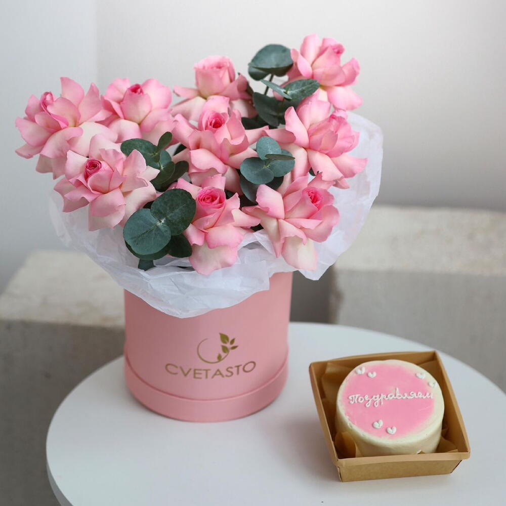 Розовые розы в коробке + бенто торт в подарок