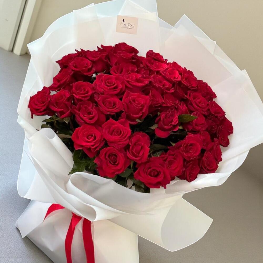 Роскошный монобукет из 51 голландской розы — воплощение элегантности и классической красоты. Глубокий красный оттенок лепестков символизирует любовь, страсть и уважение. Этот букет станет идеальным выбором для признания в любви, юбилея, свадьбы или любого особенного повода. Каждая роза тщательно отобрана, чтобы создать гармоничную и сбалансированную композицию. Плотные бутоны, насыщенный аромат и безупречная форма делают этот букет настоящим произведением флористического искусства.