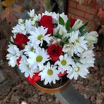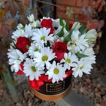 Роза красная - 5 шт. Коробка шляпная - 1 шт. Хризантема белая кустовая - 3 шт. альстромерия белая - 3 шт.