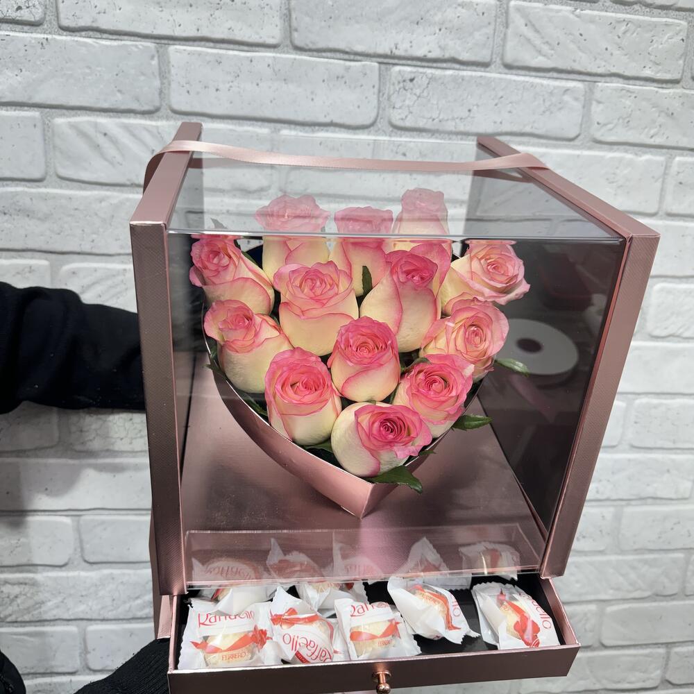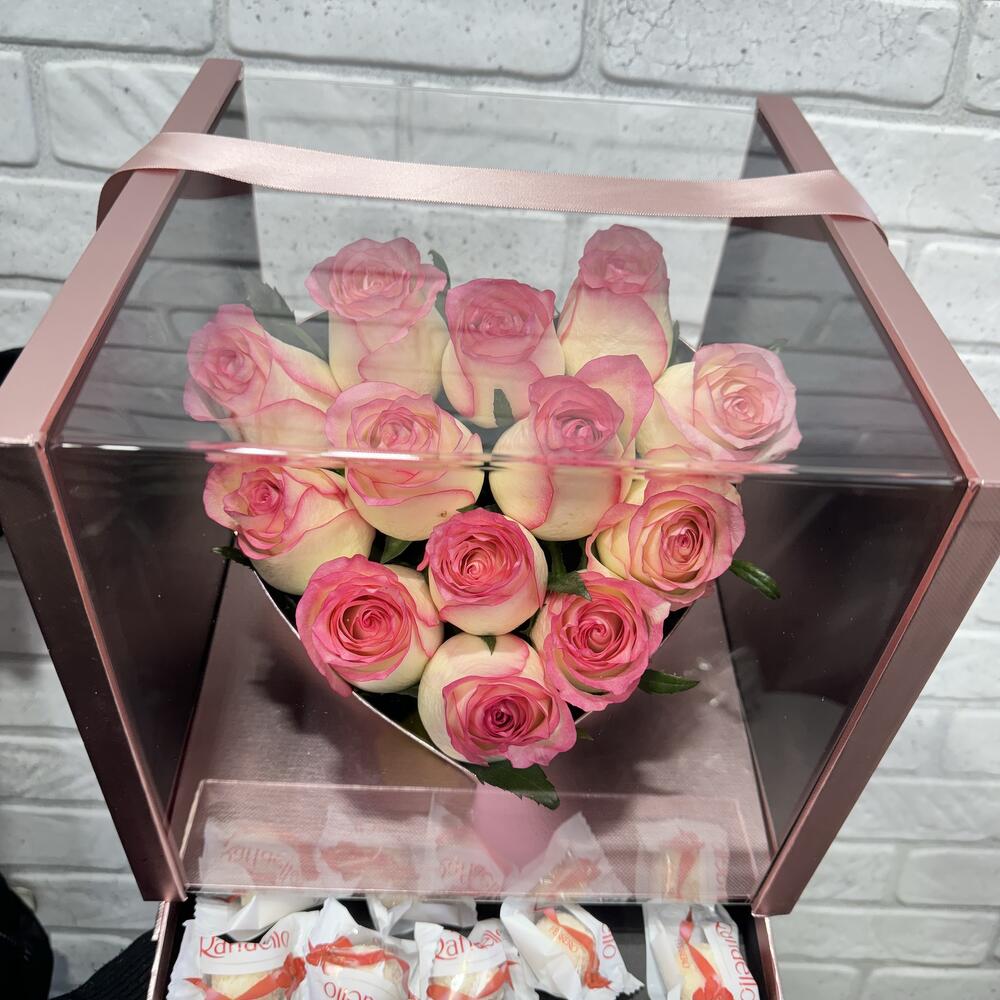Раффаэлло - 15 шт. Оазис - 1 шт. Бокс - 1 шт. розы - 15 шт.