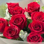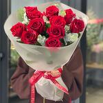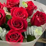 Эвкалипт - 5 шт. Упаковка дизайнерская - 1 шт. Красная роза 50 см - 11 шт. аквабокс с водой для транспортировки - 1 шт. открытка бесплатная на выбор - 1 шт.