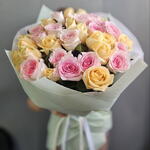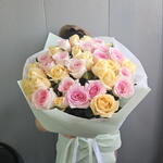 Букет из нежно розовых и персиковых роз — это воплощение нежности и утончённой романтики. Мягкие нежно розовые оттенки наполняют его лёгкостью и мечтательностью, а тёплые персиковые тона добавляют тепла и солнечного очарования. Вместе они создают гармонию, которая словно шёпотом рассказывает о трепетных чувствах, заботе и искренности. Такой букет — как утро влюблённого сердца: светлое, тёплое и незабываемое.