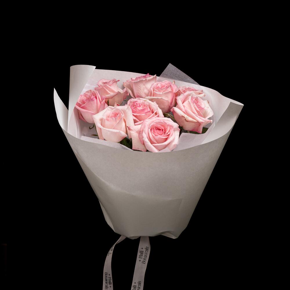 Букеты розовых ароматных садовых роз, упакованный в белую бумагу и белую коробку, с тематической открыткой по запросу. На фото букет в размере S, 9шт.