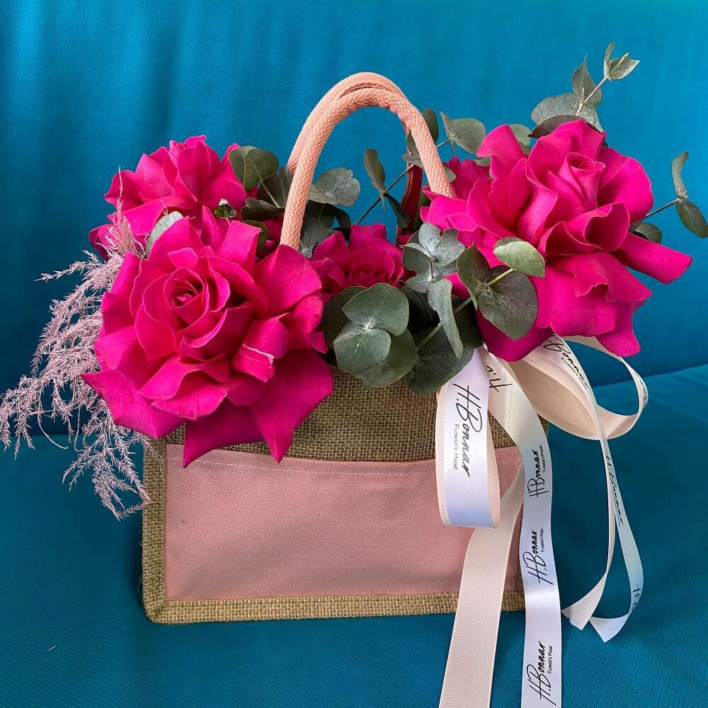 Эвкалипт - 1 шт. Роза розовая - 5 шт. Аспарагус - 2 шт. сумочка лен - 1 шт.