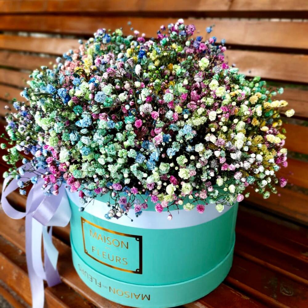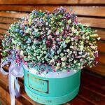 Прекрасный и необычной красоты подарок из радужных гипсофил в фирменной коробке.