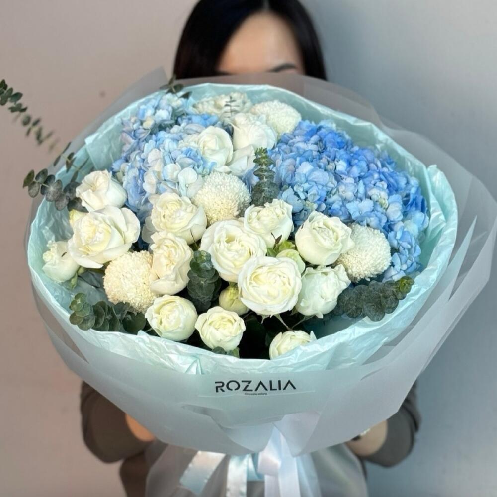 Гортензия - 2 шт. Эвкалипт - 5 шт. Оформление - 1 шт. момоко - 4 шт. спрей роза белая - 6 шт.