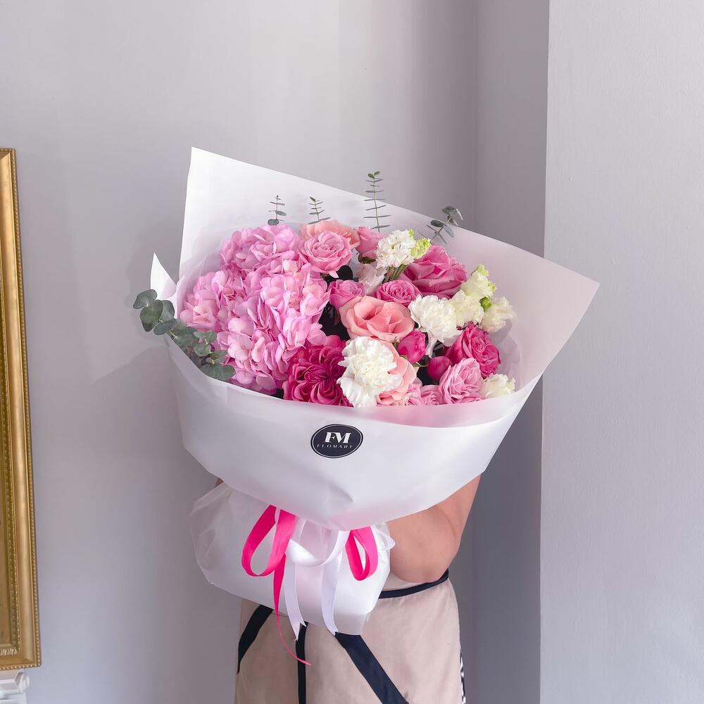 Гортензия - 1 шт. Эвкалипт - 1 шт. Роза - 3 шт. Кустовая роза - 4 шт. Эустома - 2 шт. Диантус - 2 шт. пионовидные розы - 3 шт.
