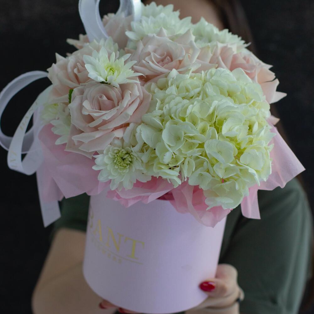 Гортензия - 1 шт. Хризантема кустовая - 1 шт. Роза - 5 шт.