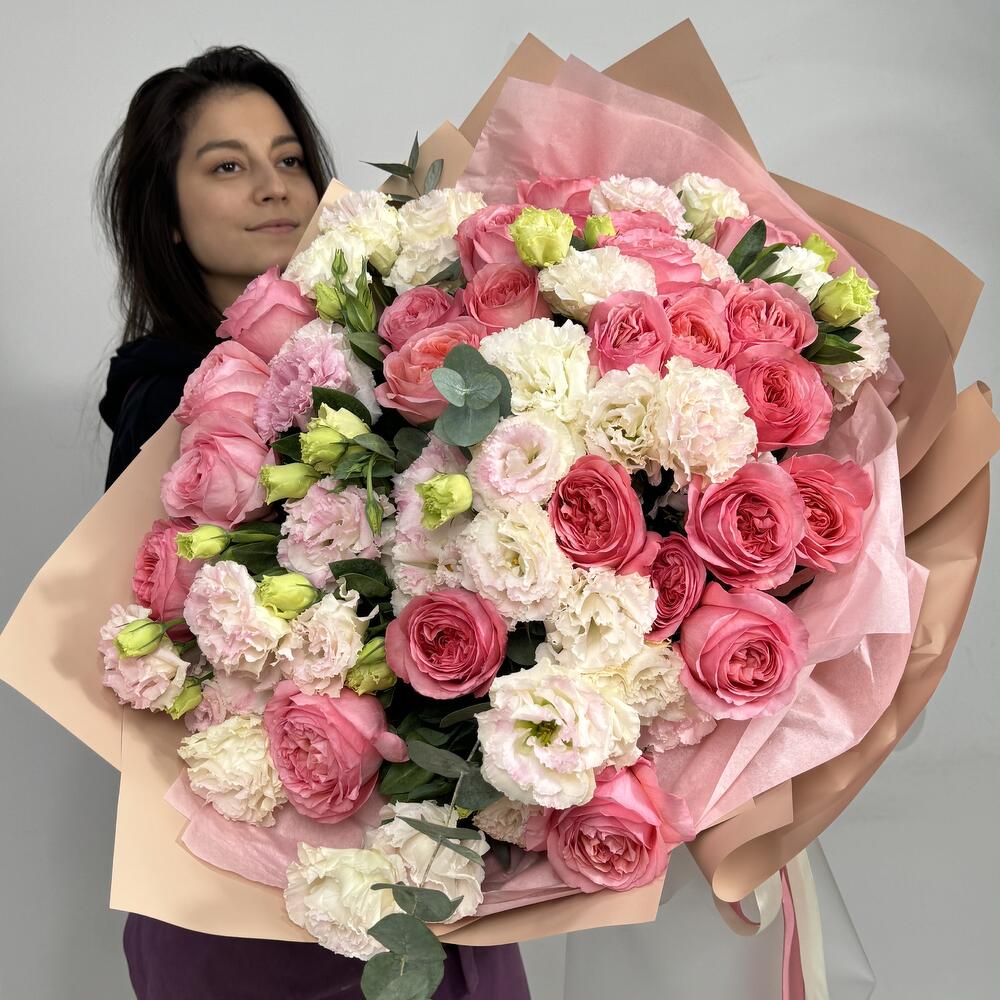 Лизиантус - 10 шт. Эвкалипт - 1 шт. Оформление - 1 шт. роза pink expression - 25 шт.