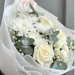 Гипсофила - 1 шт. Хризантема кустовая - 2 шт. Эвкалипт - 5 шт. Роза Эквадор - 3 шт. Упаковка дизайнерская - 5 шт.