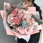 Эвкалипт - 2 шт. орхидея - 3 шт. Гвоздика сортовая - 5 шт. розы вывернутые - 9 шт.