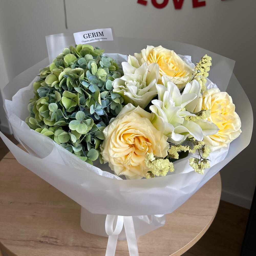 Гортензия - 1 шт. Статица - 1 шт. лилия пионовидная - 1 шт. пионовидные розы - 3 шт.
