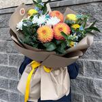 Яркий и стильный сборный букет от Оранж Алматы создан, чтобы дарить радость и настроение! Нежные белые хризантемы, пышные георгины тёплых оттенков, изящные твидии и веточки цветной гипсофилы гармонично сочетаются с элегантными розами и зеленью рускуса. Этот букет — воплощение солнечного настроения и живой энергии, идеально подходящий для поздравлений, благодарности или просто приятного сюрприза.