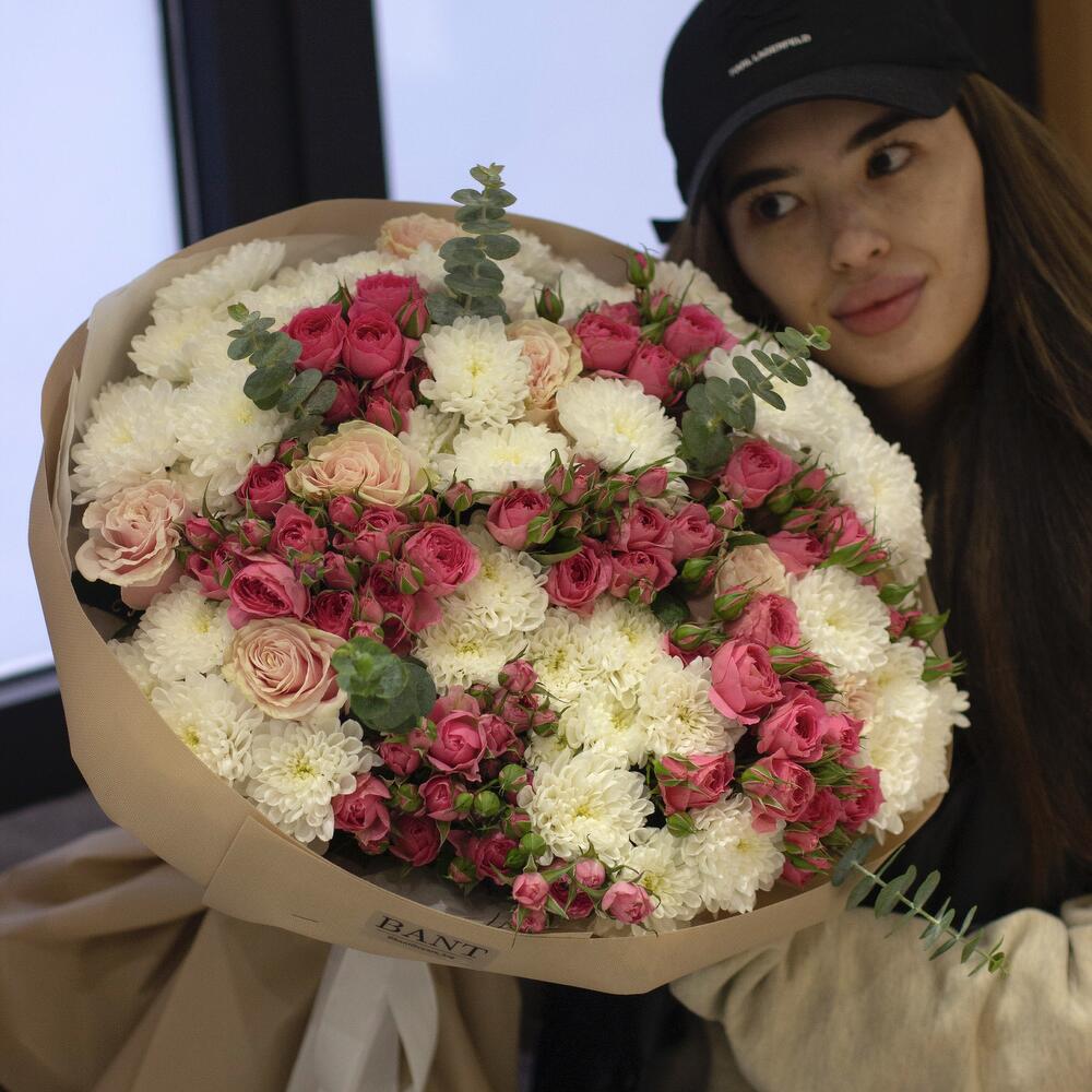 Хризантема кустовая - 9 шт. Эвкалипт - 5 шт. Роза - 9 шт. Кустовая роза - 9 шт.