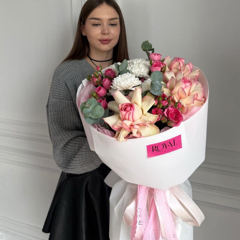 Хризантема кустовая - 2 шт. Роза - 3 шт. Кустовая роза - 3 шт. Эвкалипт Цинерея - 1 шт.