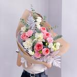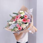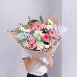 Эвкалипт - 2 шт. Роза - 3 шт. Эустома - 2 шт. Диантус - 3 шт. Пионовидная роза - 5 шт. ледер - 2 шт.