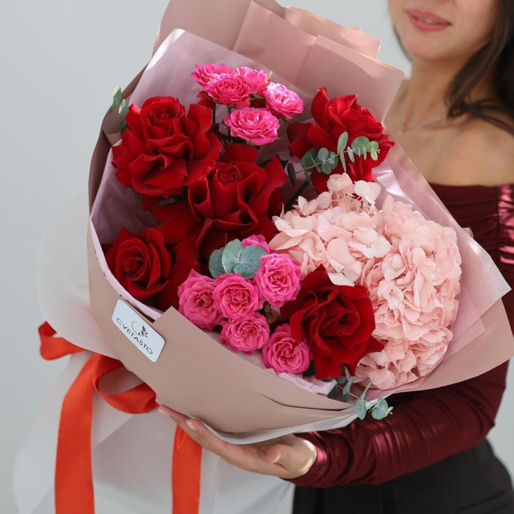 Гортензия - 1 шт. Эвкалипт - 5 шт. Роза - 5 шт. Кустовая пионовидная роза - 2 шт.