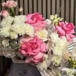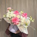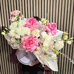 Хризантема кустовая - 2 шт. Роза - 3 шт. Диантус - 3 шт. Коробка - 1 шт. Лизиантус Алиса Белый - 3 шт. Спрей роза - 1 шт.