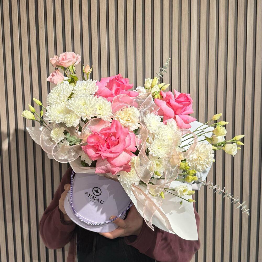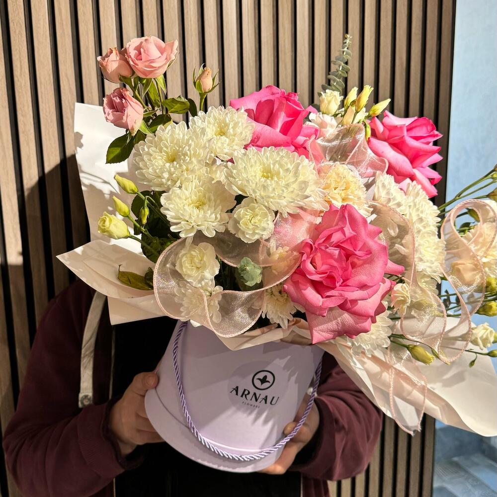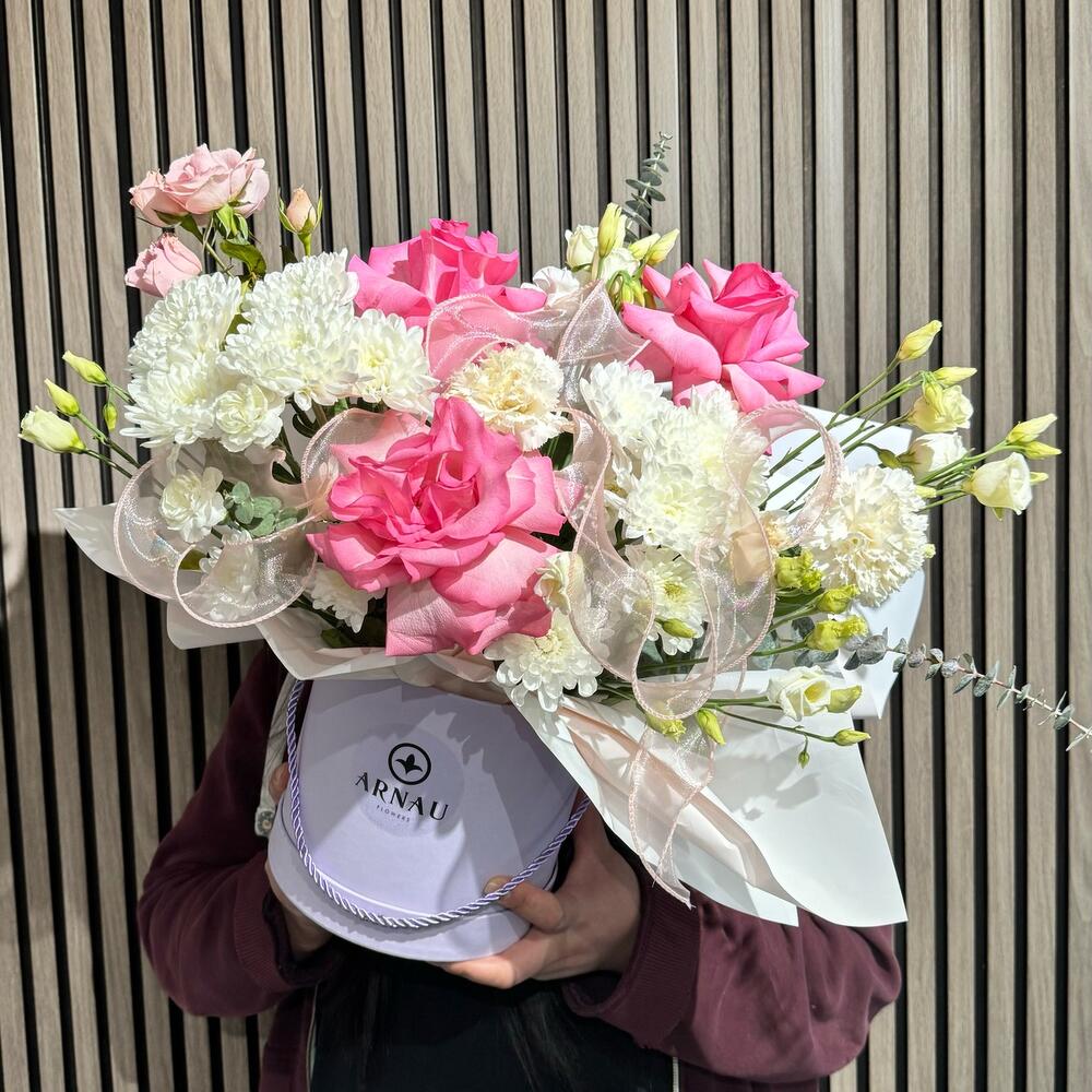 Хризантема кустовая - 2 шт. Роза - 3 шт. Диантус - 3 шт. Коробка - 1 шт. Лизиантус Алиса Белый - 3 шт. Спрей роза - 1 шт.