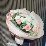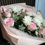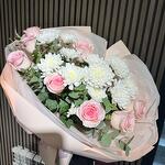 Оформление - 5 шт. Эвкалипт Baby Blue - 3 шт. розы - 8 шт. хризантема алтай кустовая - 3 шт.