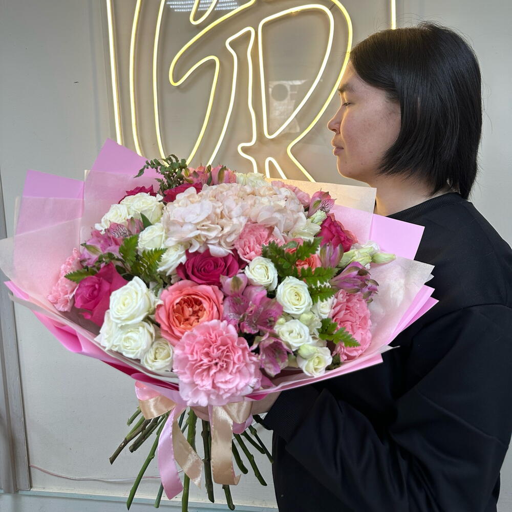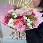 Альстромерия - 5 шт. Гортензия - 1 шт. Папоротник - 3 шт. Роза - 5 шт. Диантус - 8 шт. пионовидные розы - 5 шт. кустовые розы - 7 шт.