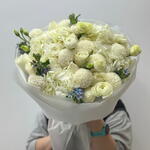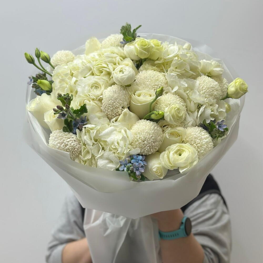 Гортензия - 3 шт. Эустома - 4 шт. Хризантема момоко - 10 шт. Твидия - 5 шт. ранункулюсы - 5 шт.