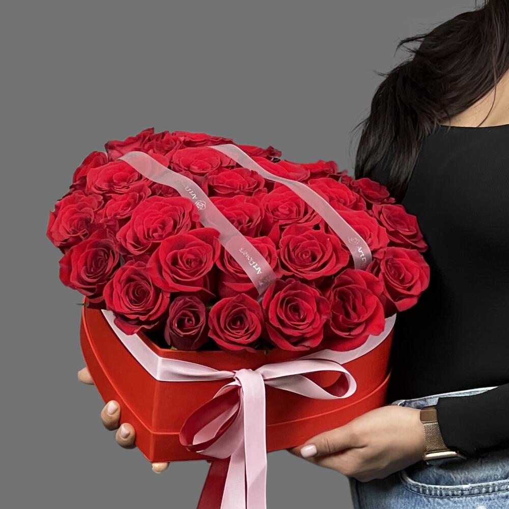 Коробка с алыми розами в форме сердца — идеальное воплощение романтики. Дарите эмоции, которые останутся в памяти надолго.