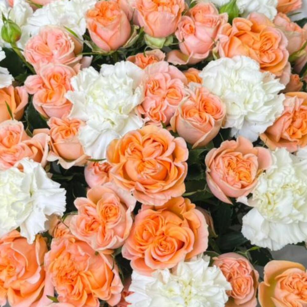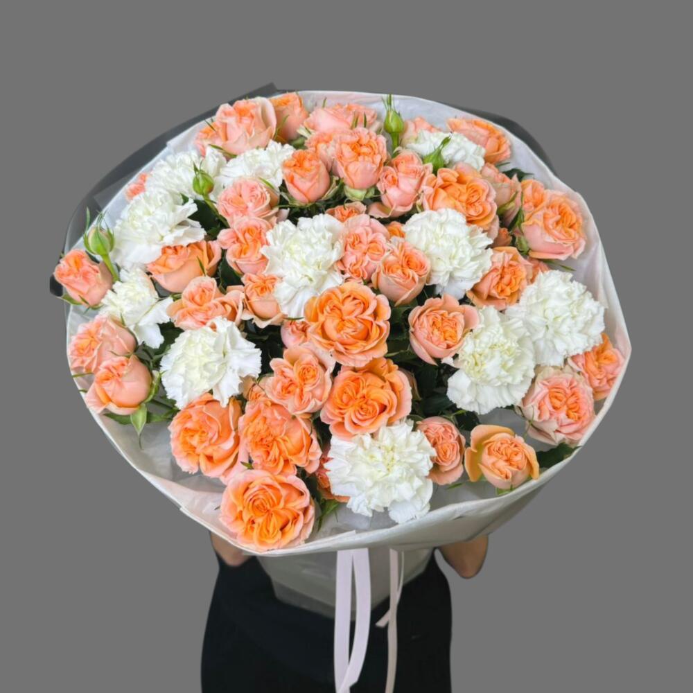 Гвоздики и кустовые розы — символ внимания, заботы и благодарности. Прекрасный выбор для подарка маме или любимому человеку.