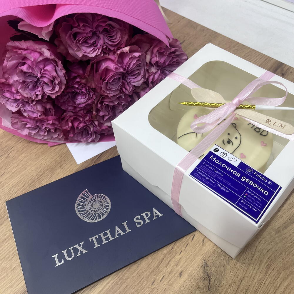 Подарочный набор, созданный для особых моментов. В него входит изящный букет роз, бенто-тортик с индивидуальным дизайном по вашему желанию и сертификат в Thai Spa на любую стоимость. Такой сертификат можно использовать в любом филиале, он дарит возможность расслабиться, восстановиться и почувствовать заботу. Комбинация сладкого, цветов и полноценного спа-отдыха делает этот набор идеальным подарком, который вызывает эмоции и оставляет тёплое впечатление надолго. Сертификат на массаж в премиальном спа-салоне «Lux Thai Spa», который подарит расслабление и гармонию вашему телу и душе. Один из лучших премиум-спа в Алматы, с 3 филиалами(сертификат работает во всех) Номинал сертификата - 10,000. Может быть отправлен физически и также цифровой. Номинал может быть увеличен, по вашим предпочтениям.