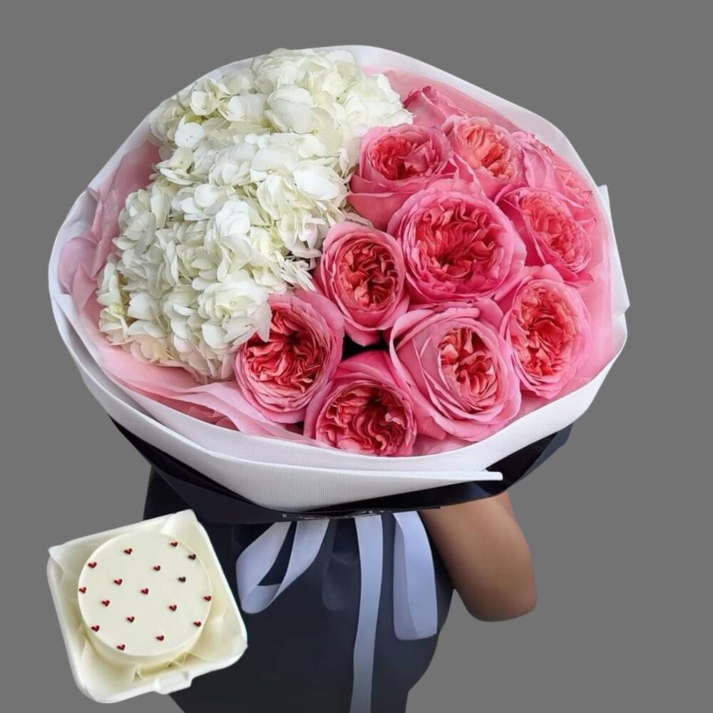 Гортензия - 2 шт. Пионовидная роза - 11 шт. аква бумага - 1 шт. бенто торт молочная девочка 250 г - 1 шт.