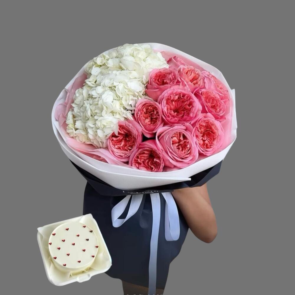 Гортензия - 2 шт. аква бумага - 1 шт. голландские пионовидные розы 50 см - 11 шт. бенто торт * молочная девочка * 250 гр - 1 шт.