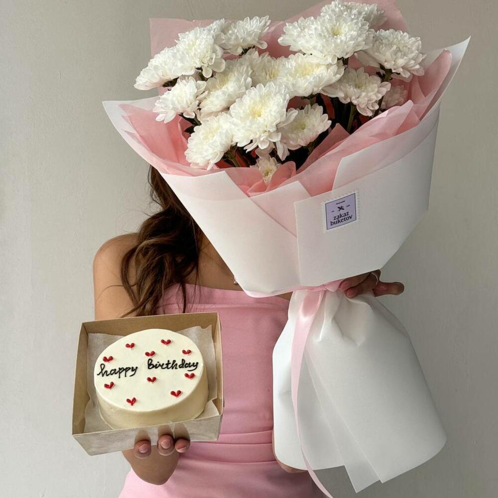 Для настроения – лёгкий и трогательный сет, который подарит улыбку и тепло. Нежный букет белоснежных хризантем в сочетании с милым бенто-тортом Happy Birthday – это идеальный способ выразить внимание и создать праздничное настроение.
