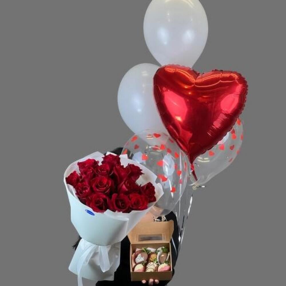 Шар - 4 шт. Шар фольгированный - 1 шт. Голландская роза - 15 шт. клубника в шоколаде 300 гр - 1 шт.
