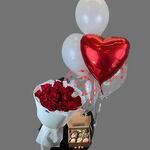 Сногсшибательный букет алых роз + нежные шары + сладкое наслаждение. Этот роскошный набор – однозначный ключ к счастью! Букет, воздушные шары и сладости создадут волшебную атмосферу радости и любви.