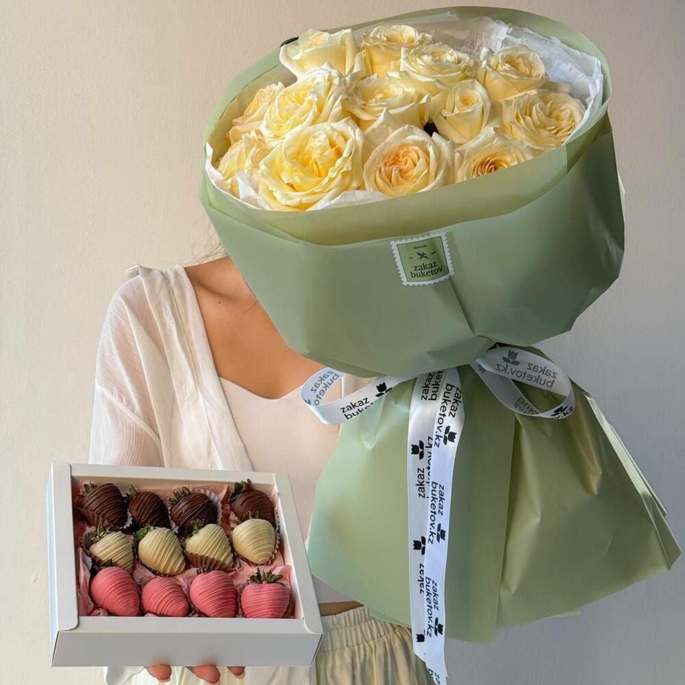 Кэнди – яркий и вкусный сет для самых сладких моментов. Букет из кремовых роз в стильной зелёной упаковке идеально сочетается с набором клубники в трёх видах шоколада.