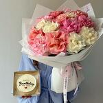 Красивый, пышный букет. Видно что свежий. Но, я просила положить пустую открытку чтобы самой подписать - но не положили. А так, все ок