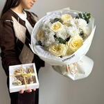 Эвкалипт - 1 шт. Хризантема - 3 шт. пионовидные розы - 5 шт. финики в шоколаде 6шт - 1 шт.