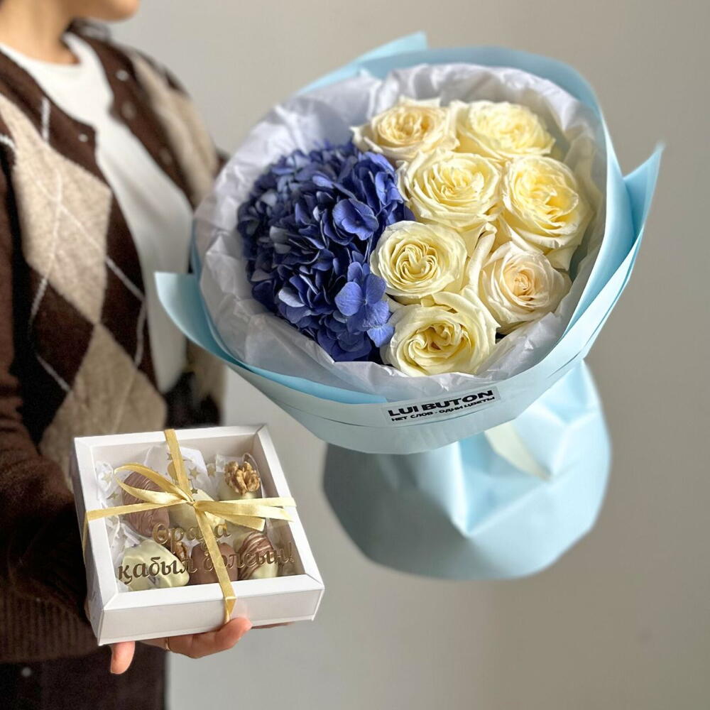 Гортензия - 1 шт. пионовидные розы - 7 шт. финики в шоколаде 6шт - 1 шт.