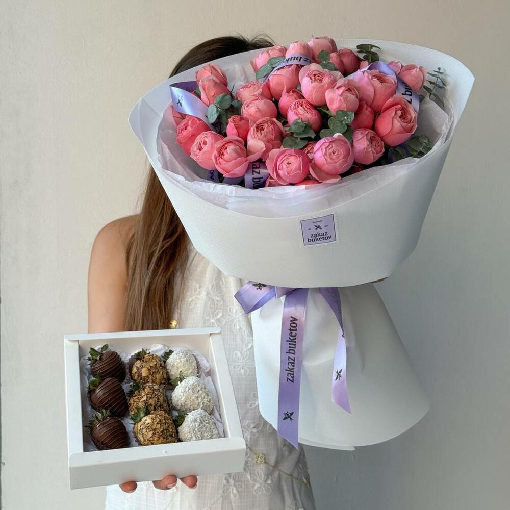 Рассвет любви – роскошный сет для самых трепетных моментов. Нежный букет из пионовидных роз в утончённом розовом оттенке и набор клубники в шоколаде создают атмосферу романтики и радости.