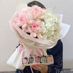 Сет "Розовое чудо": букет из гортензии и роз + клубника в шоколаде