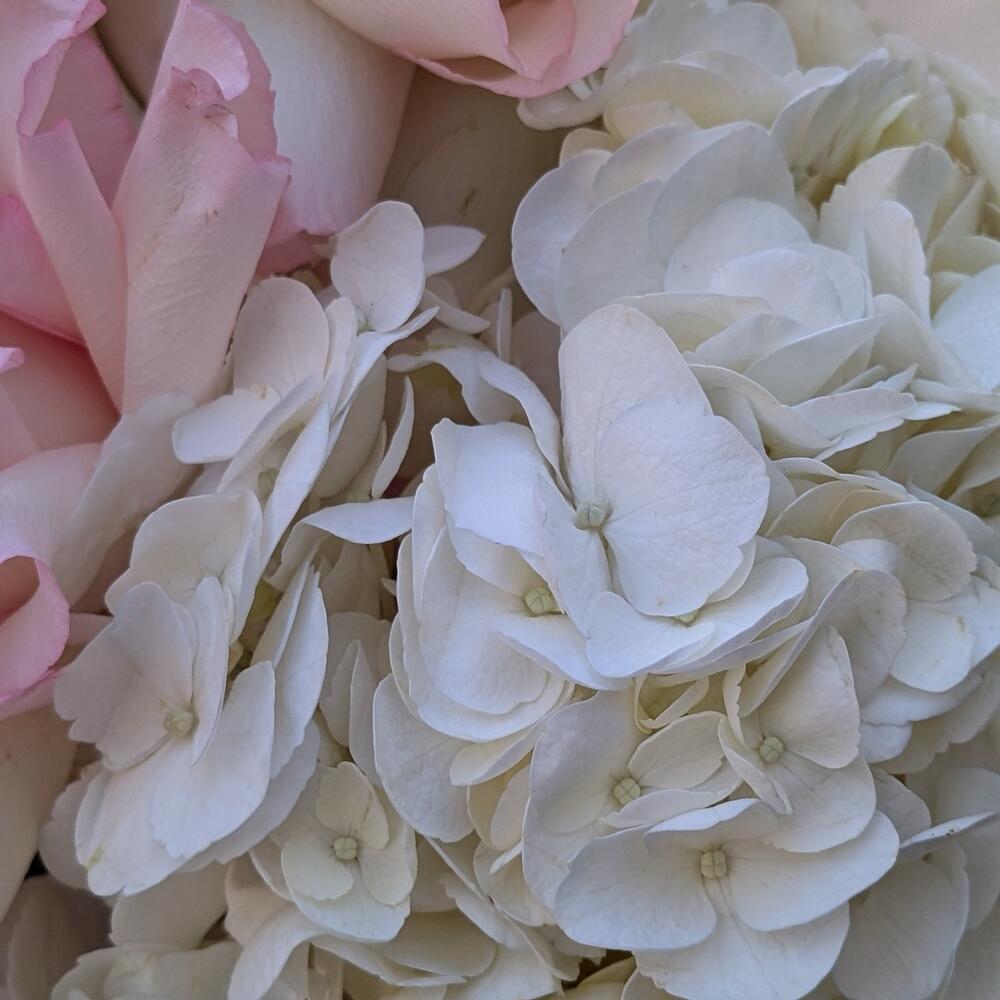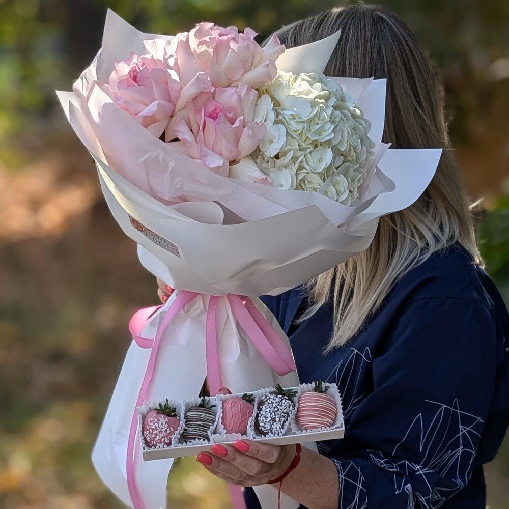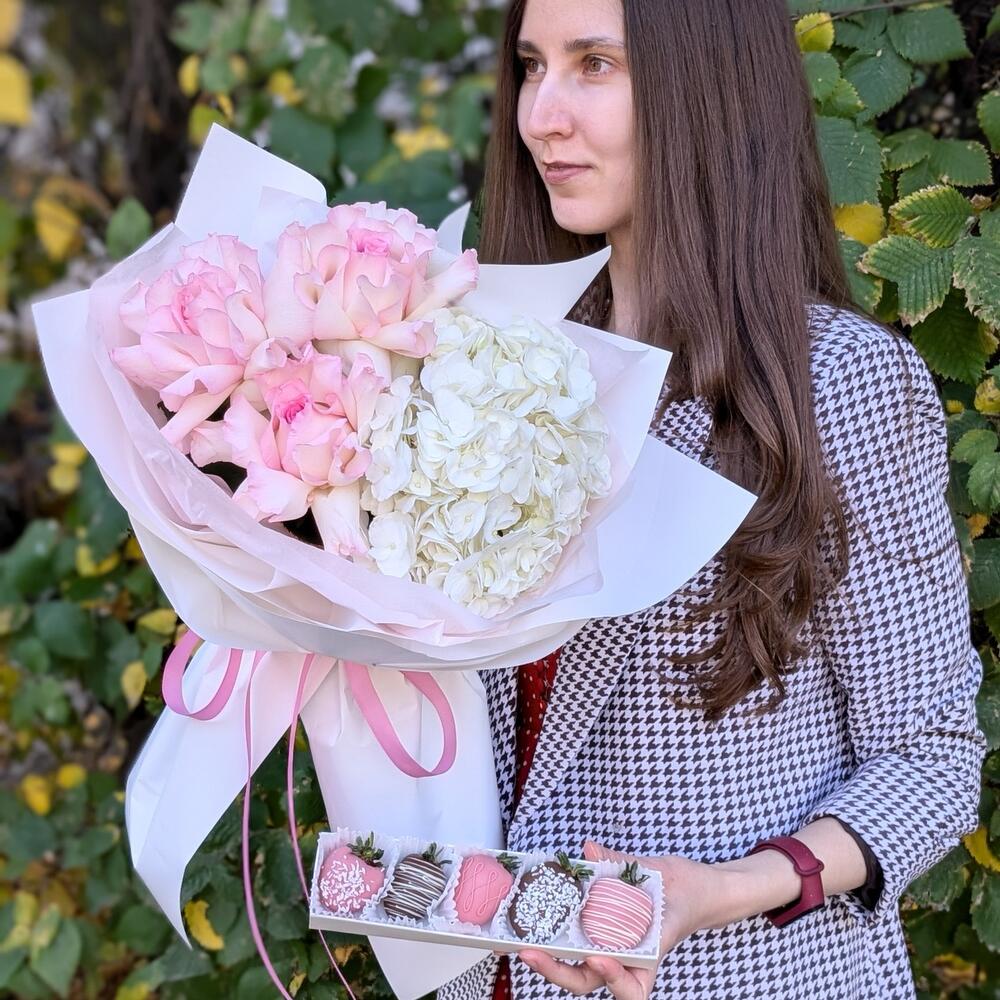Сет "Розовое чудо": букет из гортензии и роз + клубника в шоколаде