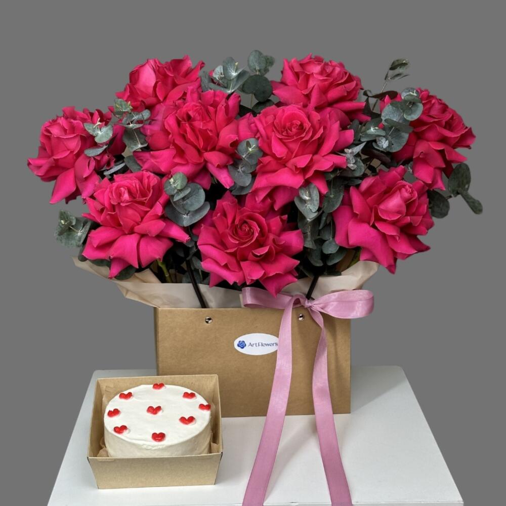 Эвкалипт - 1 шт. Сумка - 1 шт. розы 50 см - 9 шт. бенто торт * молочная девочка * - 1 шт.