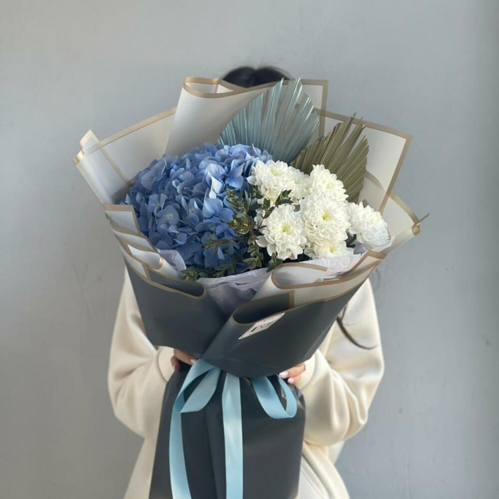 Гортензия - 2 шт. Эвкалипт - 1 шт. Хризантема - 2 шт. Лист пальмы - 2 шт.
